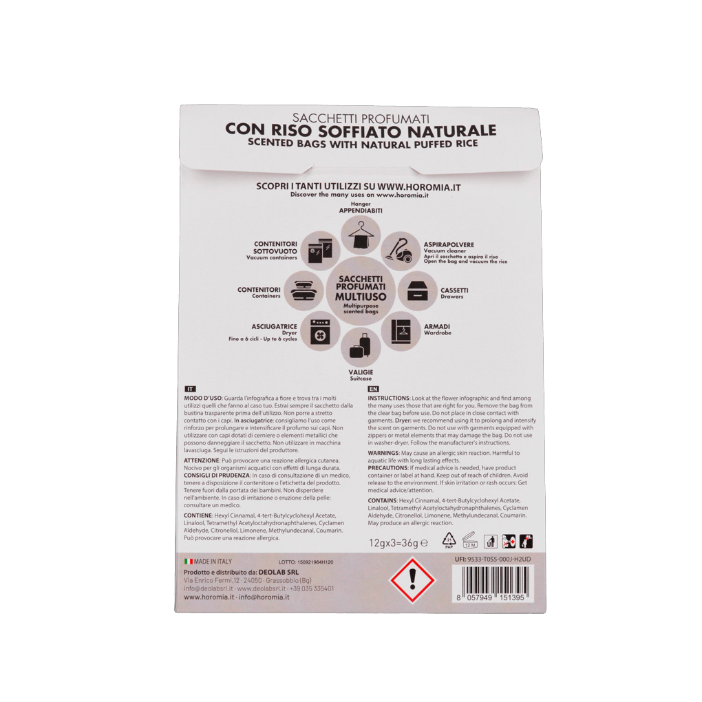 Unique intense fragrances of Horomia are now also available in multifunctional scented sachets. The scented sachets are made from natural non-food puffed rice and are designed to give your clothes and home a unique and indispensable fragrant scent. Each package contains three scented sachets, which are intended for multiple uses. The scented sachets are ideally used in combination with the same fragrance laundry perfume, which you can find in our offer.