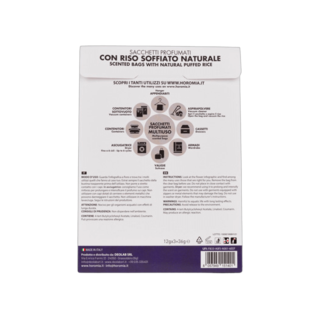 Edinstvene intenzivne dišave Horomia sedaj tudi v večnamenskih dišečih vrečkah. Dišeče vrečke so ustvarjene iz naravnega neživilskega napihnjenega riža in so oblikovane tako, da vašim oblačilom in vašemu domu dajejo edinstven in nepogrešljiv dišeč vonj. Vsako pakiranje vsebuje tri dišeče vrečke, katere so namenjene za večkratno uporabo. Dišeče vrečke se idealno uporabljajo v kombinaciji z istim vonjem parfuma za pranje perila, ki jih najdete v naši ponudbi.