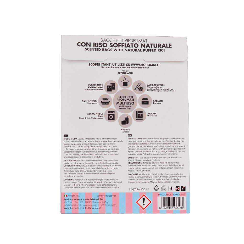 Edinstvene intenzivne dišave Horomia sedaj tudi v večnamenskih dišečih vrečkah. Dišeče vrečke so ustvarjene iz naravnega neživilskega napihnjenega riža in so oblikovane tako, da vašim oblačilom in vašemu domu dajejo edinstven in nepogrešljiv dišeč vonj. Vsako pakiranje vsebuje tri dišeče vrečke, katere so namenjene za večkratno uporabo. Dišeče vrečke se idealno uporabljajo v kombinaciji z istim vonjem parfuma za pranje perila, ki jih najdete v naši ponudbi.