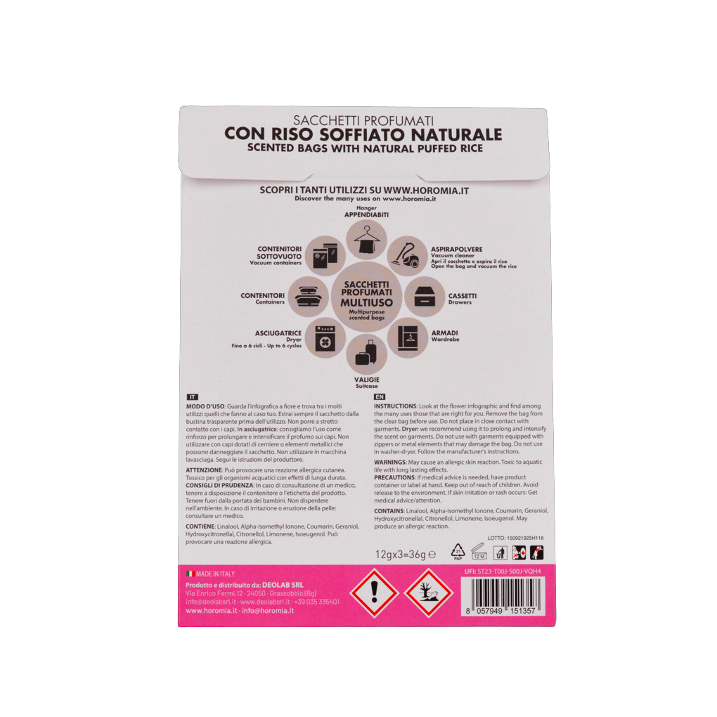 Edinstvene intenzivne dišave Horomia sedaj tudi v večnamenskih dišečih vrečkah. Dišeče vrečke so ustvarjene iz naravnega neživilskega napihnjenega riža in so oblikovane tako, da vašim oblačilom in vašemu domu dajejo edinstven in nepogrešljiv dišeč vonj. Vsako pakiranje vsebuje tri dišeče vrečke, katere so namenjene za večkratno uporabo. Dišeče vrečke se idealno uporabljajo v kombinaciji z istim vonjem parfuma za pranje perila, ki jih najdete v naši ponudbi.