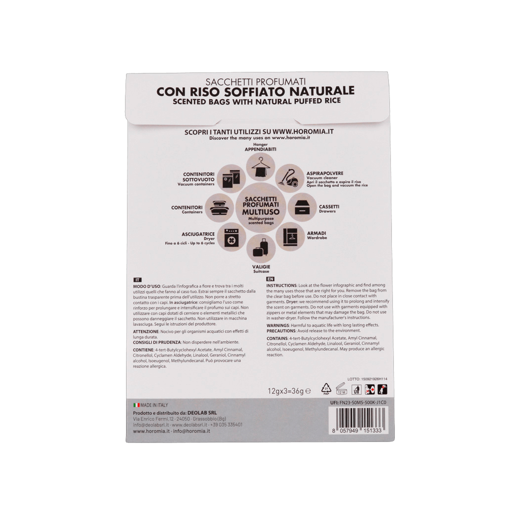 Edinstvene intenzivne dišave Horomia sedaj tudi v večnamenskih dišečih vrečkah. Dišeče vrečke so ustvarjene iz naravnega neživilskega napihnjenega riža in so oblikovane tako, da vašim oblačilom in vašemu domu dajejo edinstven in nepogrešljiv dišeč vonj. Vsako pakiranje vsebuje tri dišeče vrečke, katere so namenjene za večkratno uporabo. Dišeče vrečke se idealno uporabljajo v kombinaciji z istim vonjem parfuma za pranje perila, ki jih najdete v naši ponudbi.